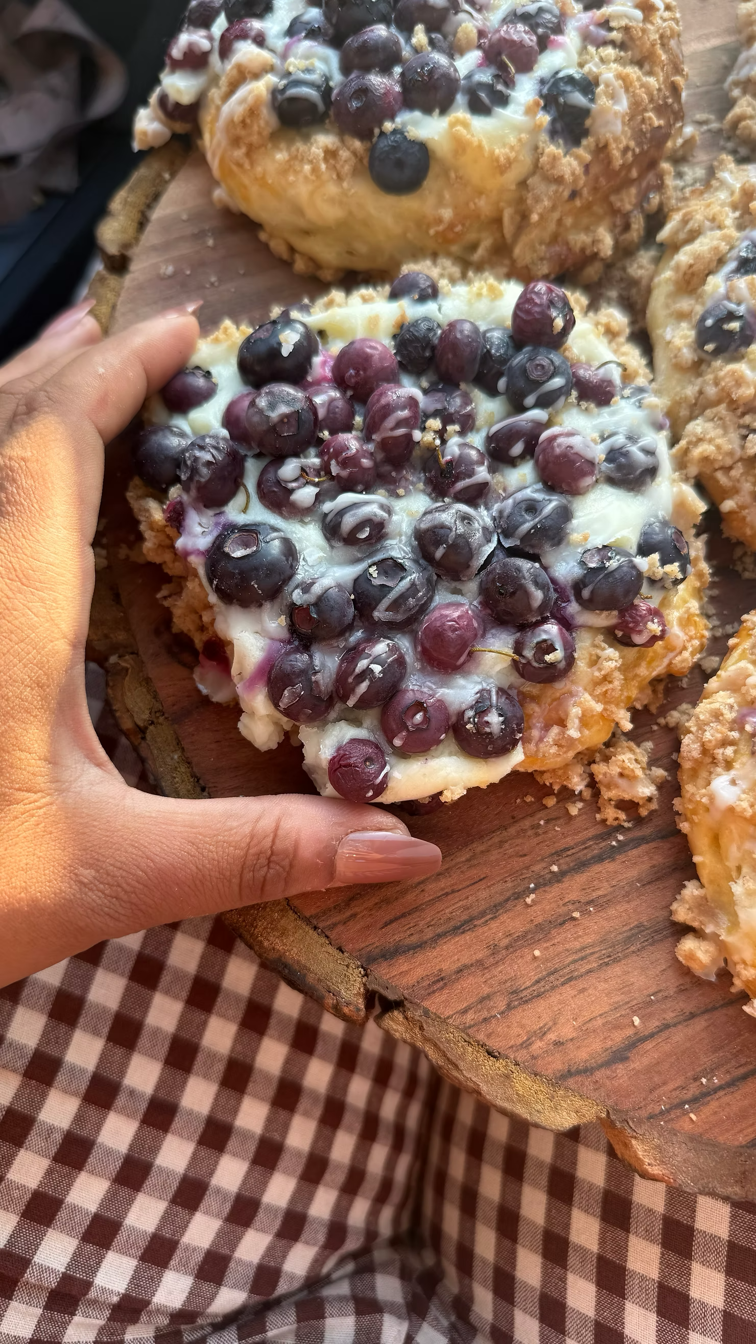 ✨ These buns come out pillowy and rich, with creamy cheesecake centers, bursts of blueberry, a buttery crumble crunch, and that sweet finishing glaze.
