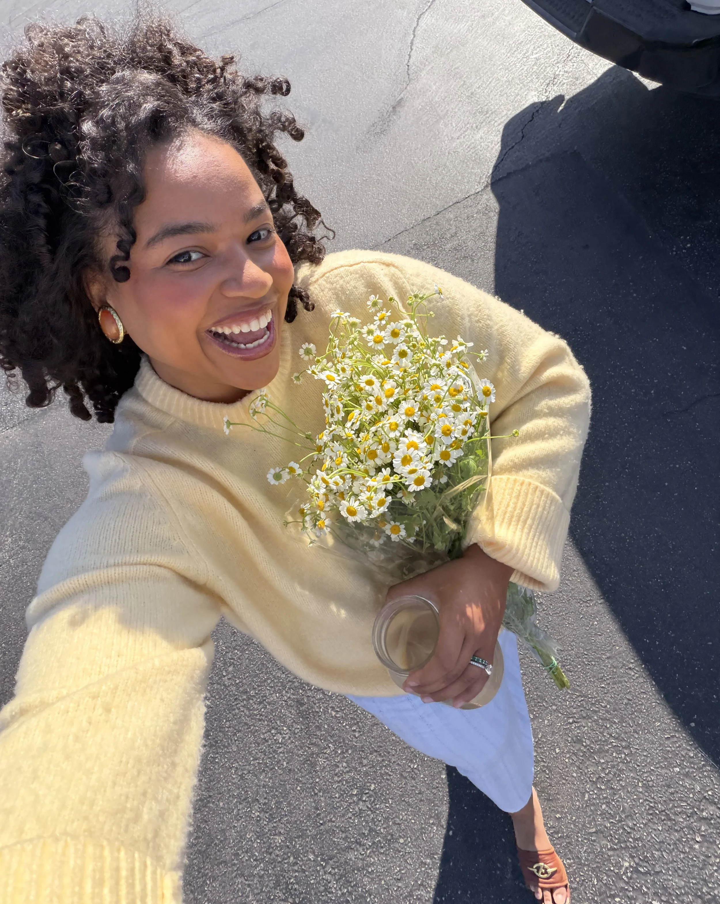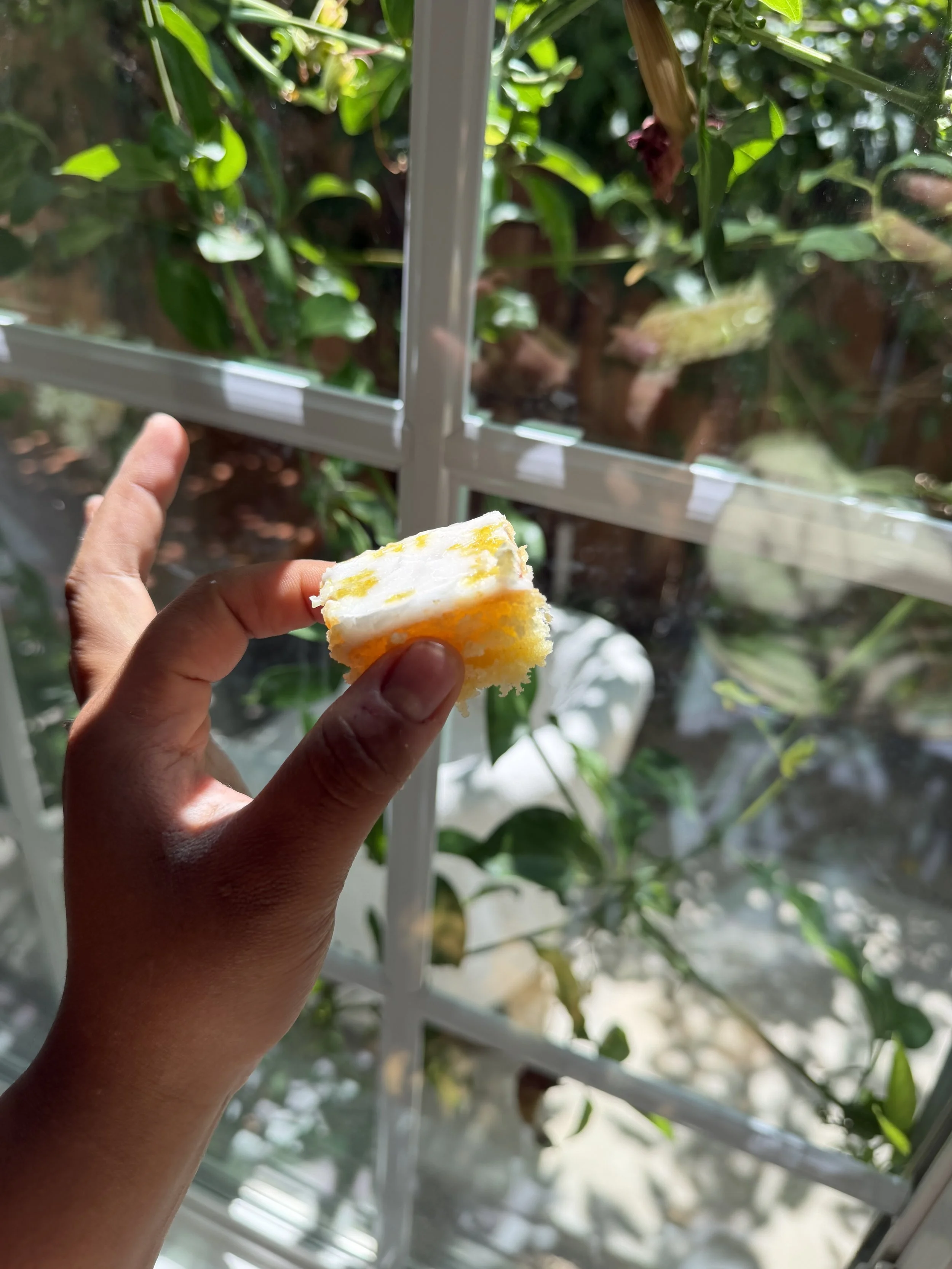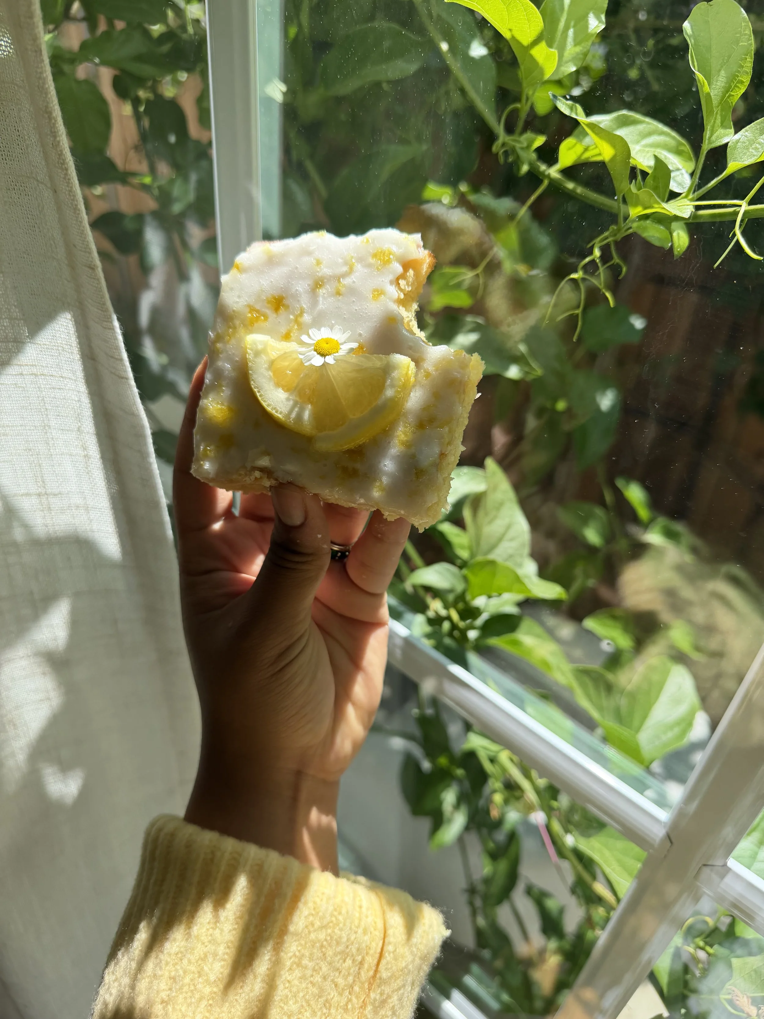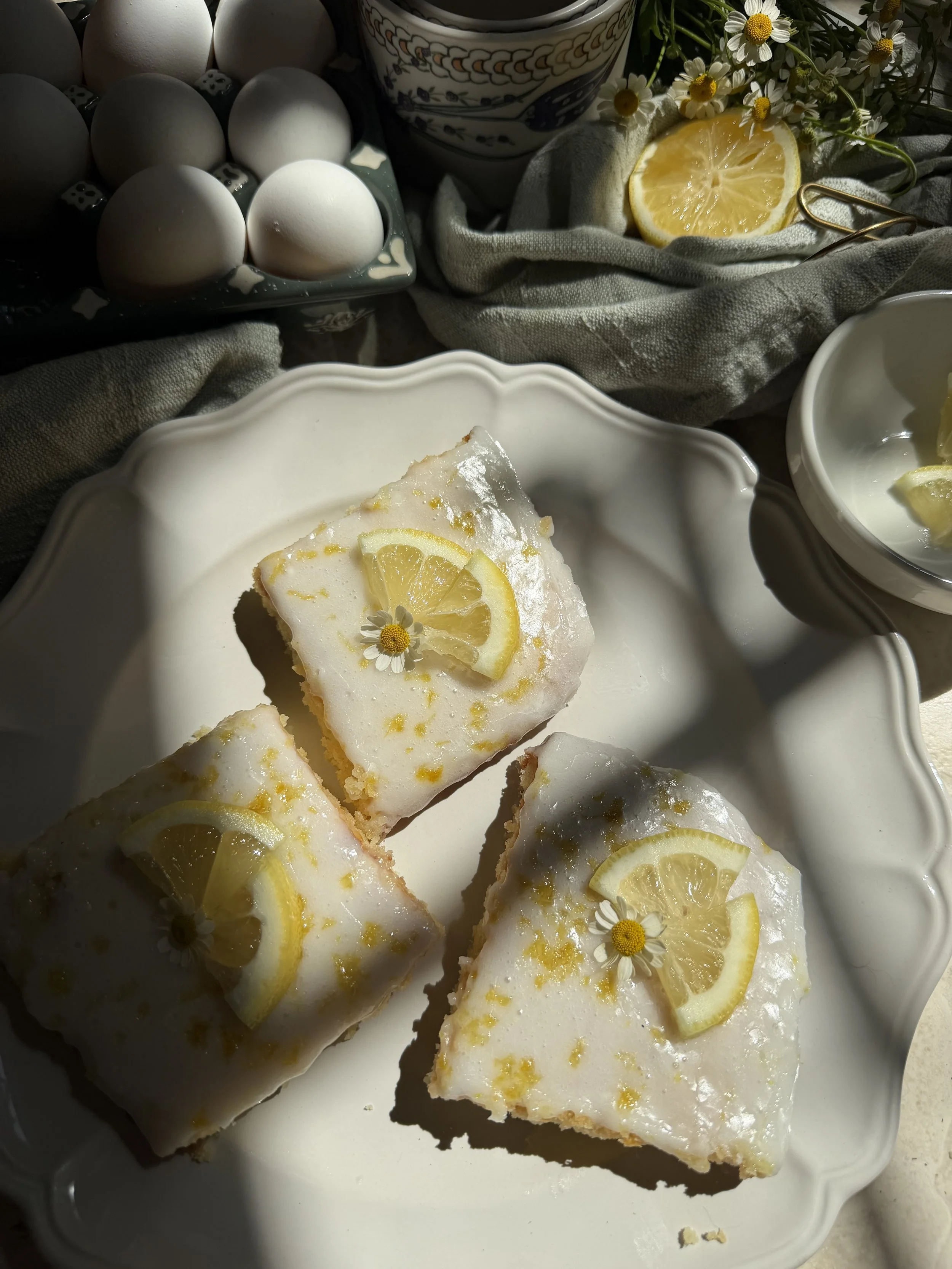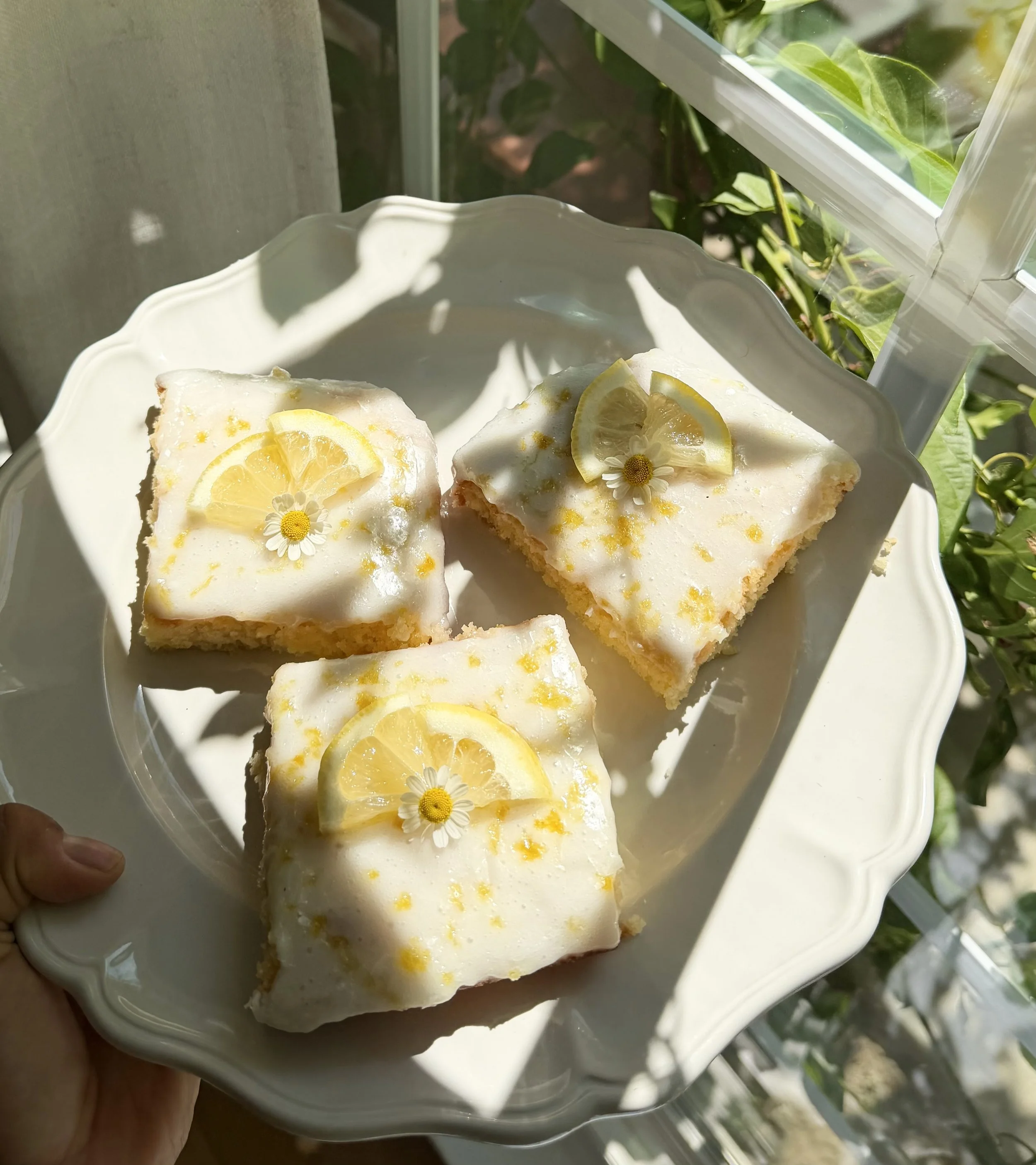 Heading home with some lovely chamomile flowers this morning! It is finally spring and these lemon blondies sure do taste like it! Of course, I had to garnish with florals, as always. Growing up, my favorite spring dessert was lemon pound cake. These lemon blondies have a similar dense, yet, fluffy texture! I could eat them all day!