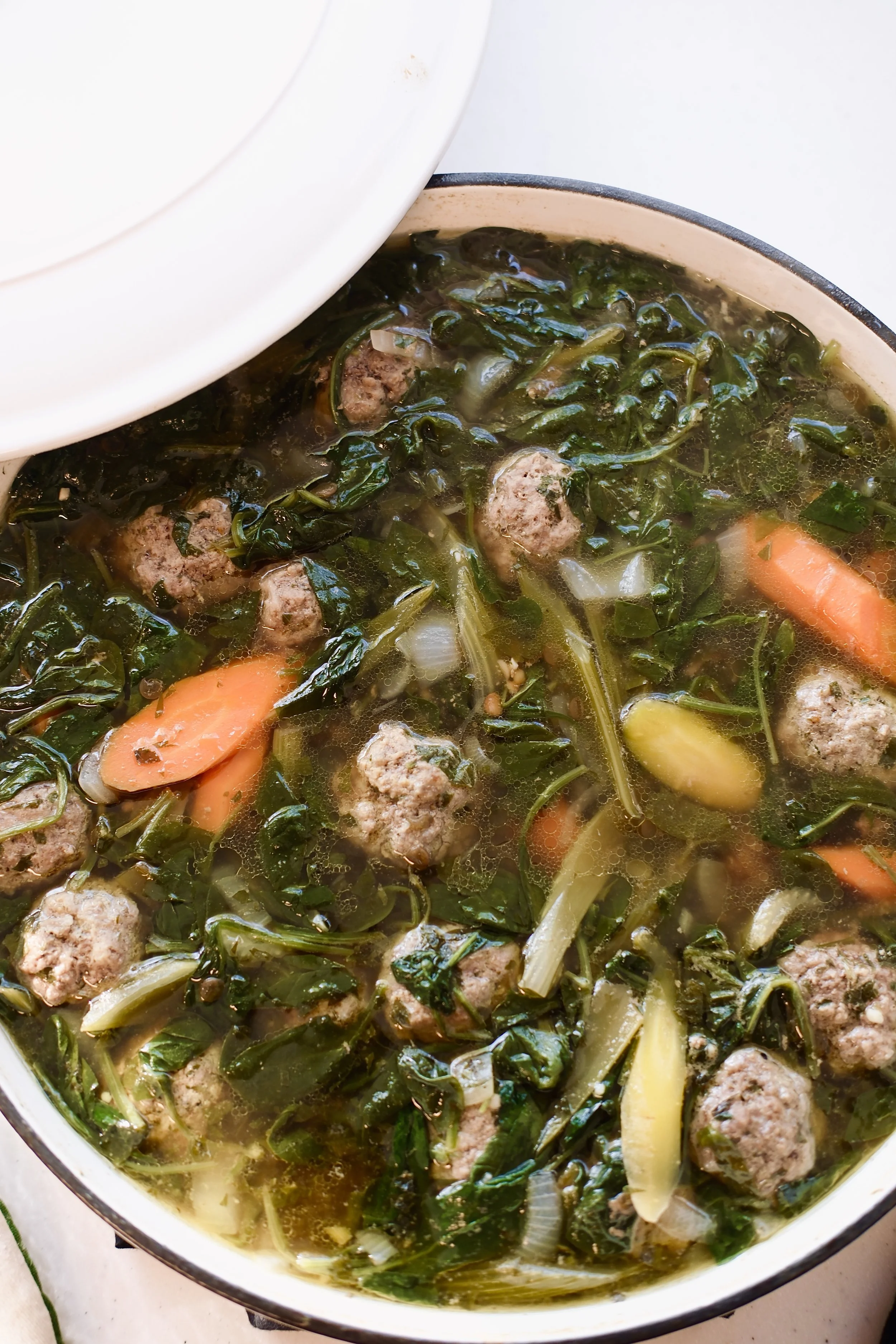 A cozy, slow-simmered soup packed with vegetables, herby beef meatballs, lentils, and greens. Deeply savory, grounding, and nourishing.