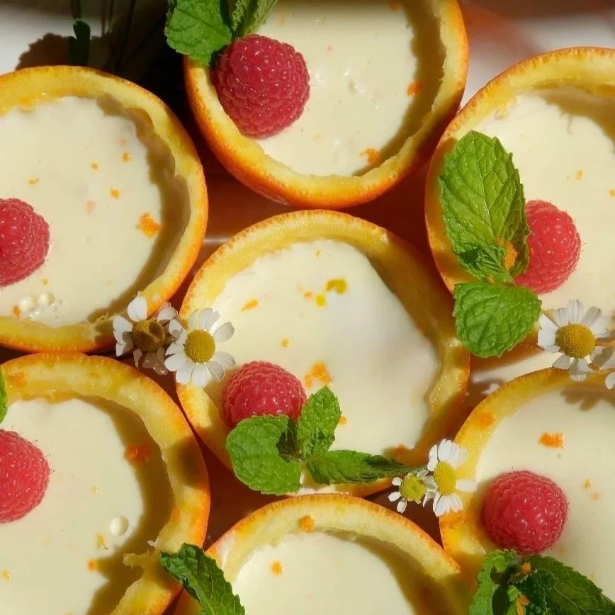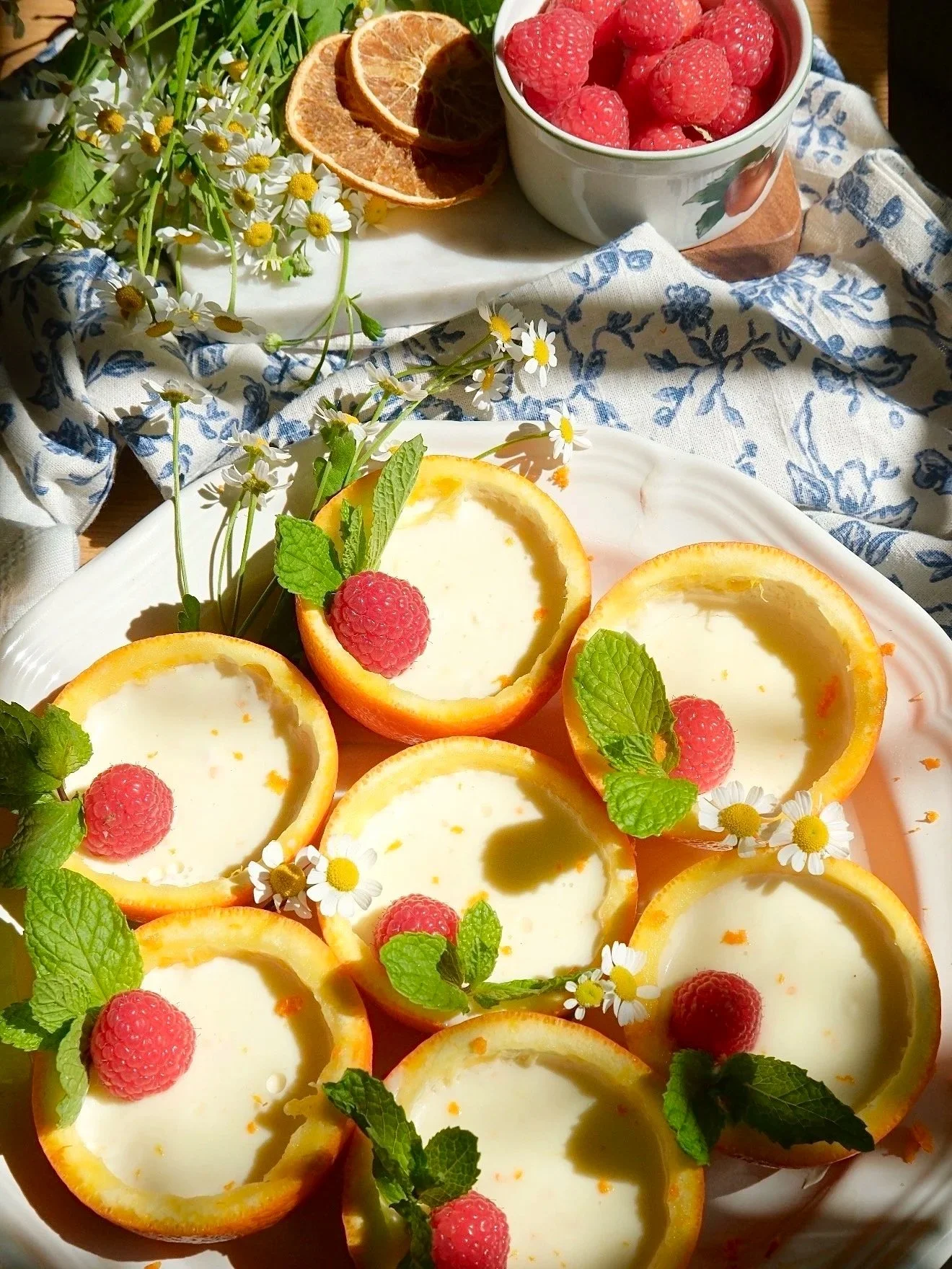 I made this version with fresh oranges and finished it with raspberries, mint, and a little chamomile for a soft, springy feel. It’s the kind of dessert that looks beautiful on a table but takes almost no effort.