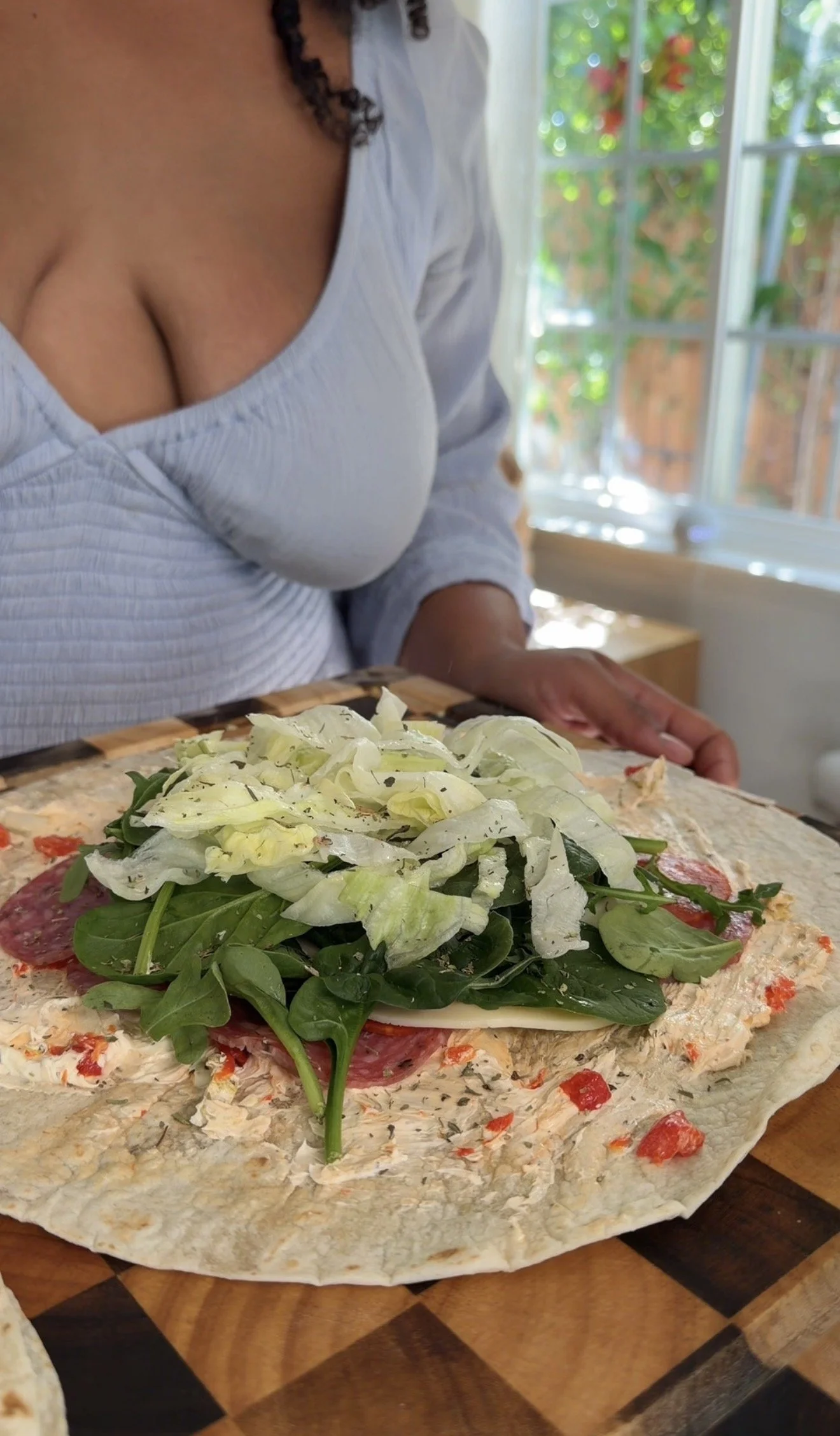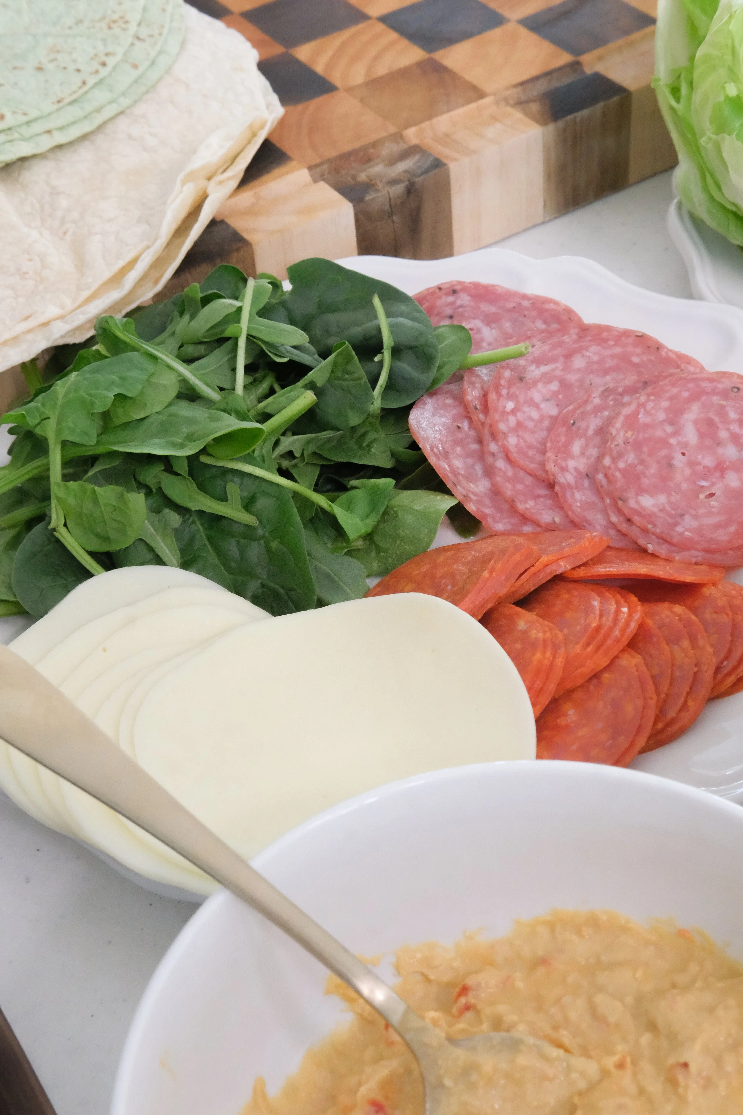- Spread a layer of the cream cheese mixture over a tortilla. Add salami, pepperoni, provolone, spinach, iceberg lettuce, and a dash of Italian seasoning. Roll tightly.