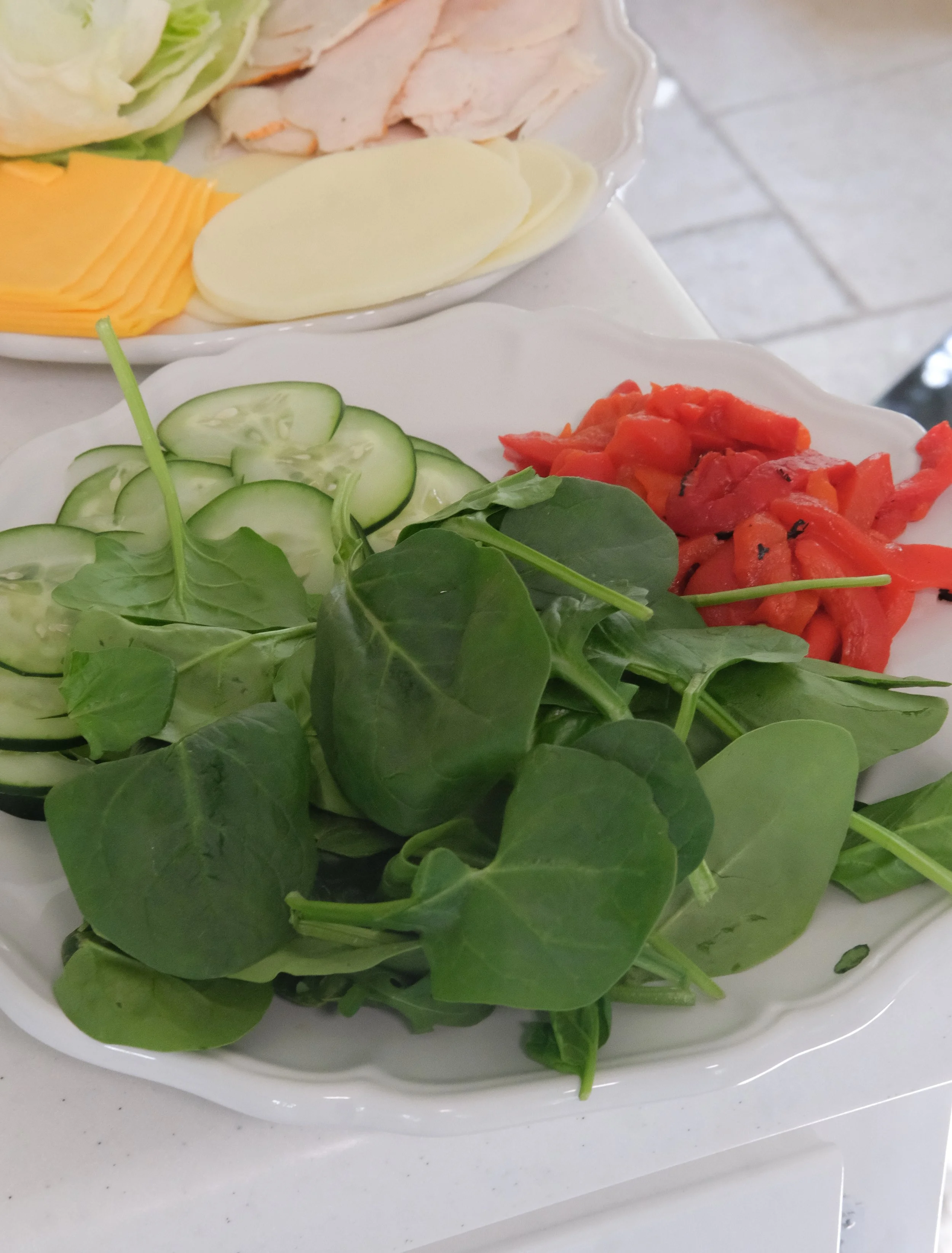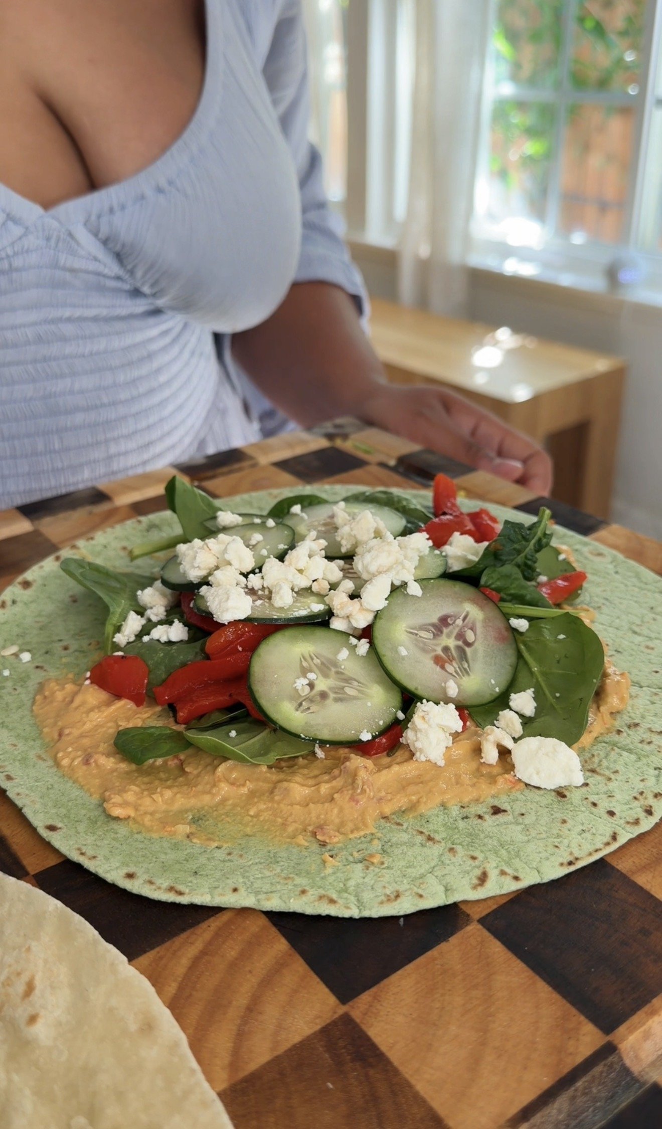 - For the veggie pinwheels, spread red pepper hummus over a spinach tortilla. Add spinach, roasted red peppers, cucumber slices, and feta cheese. Roll tightly.