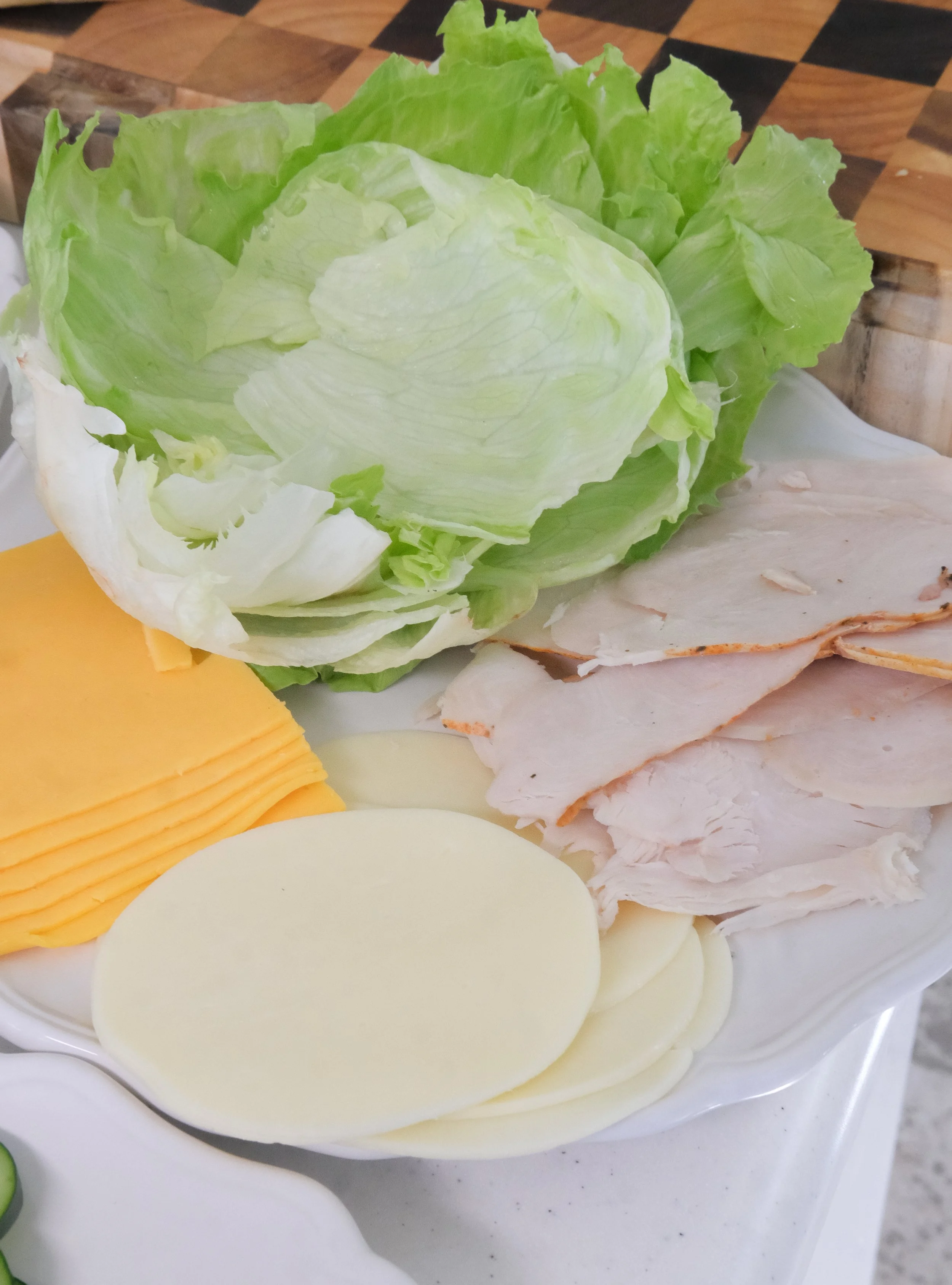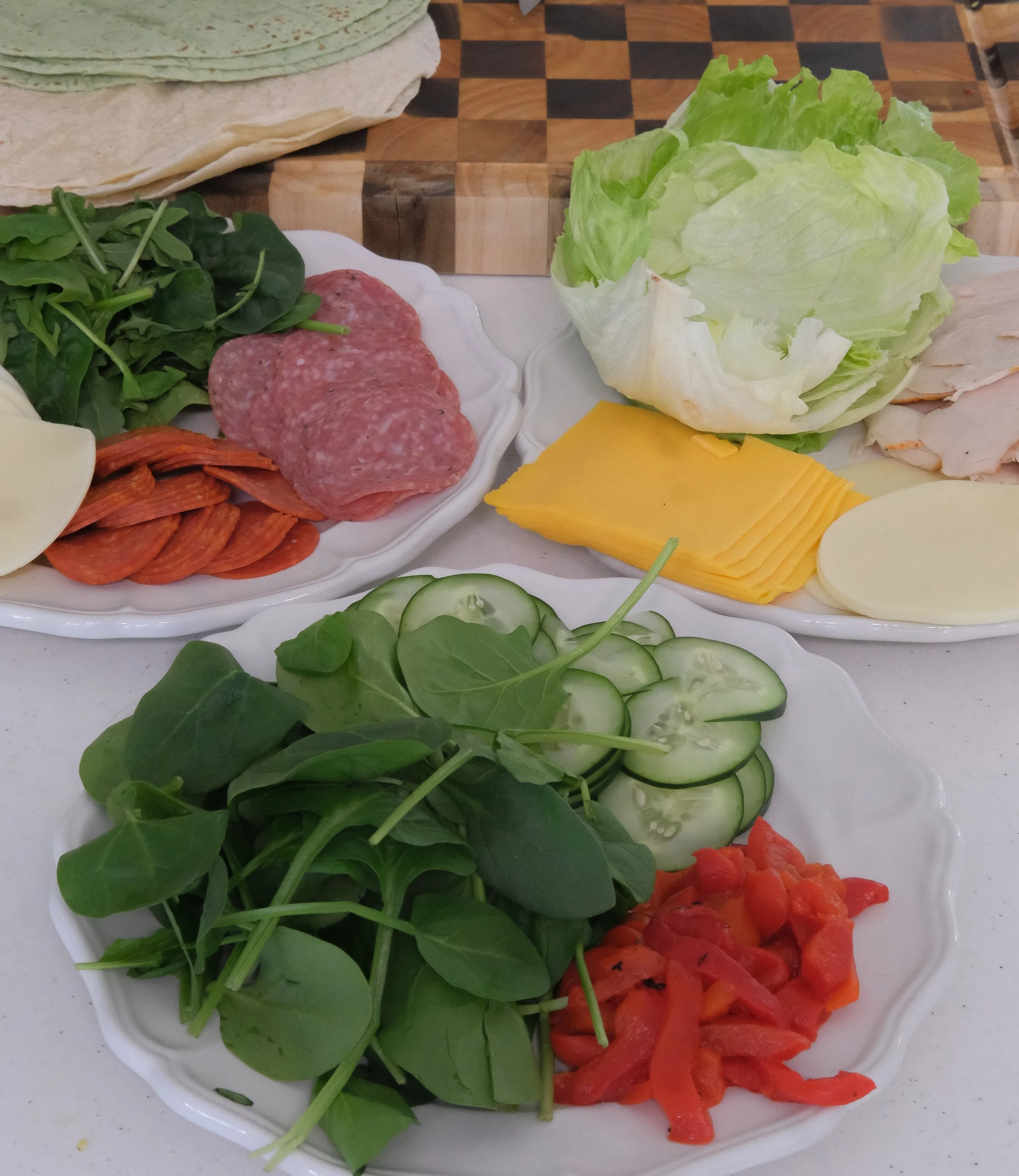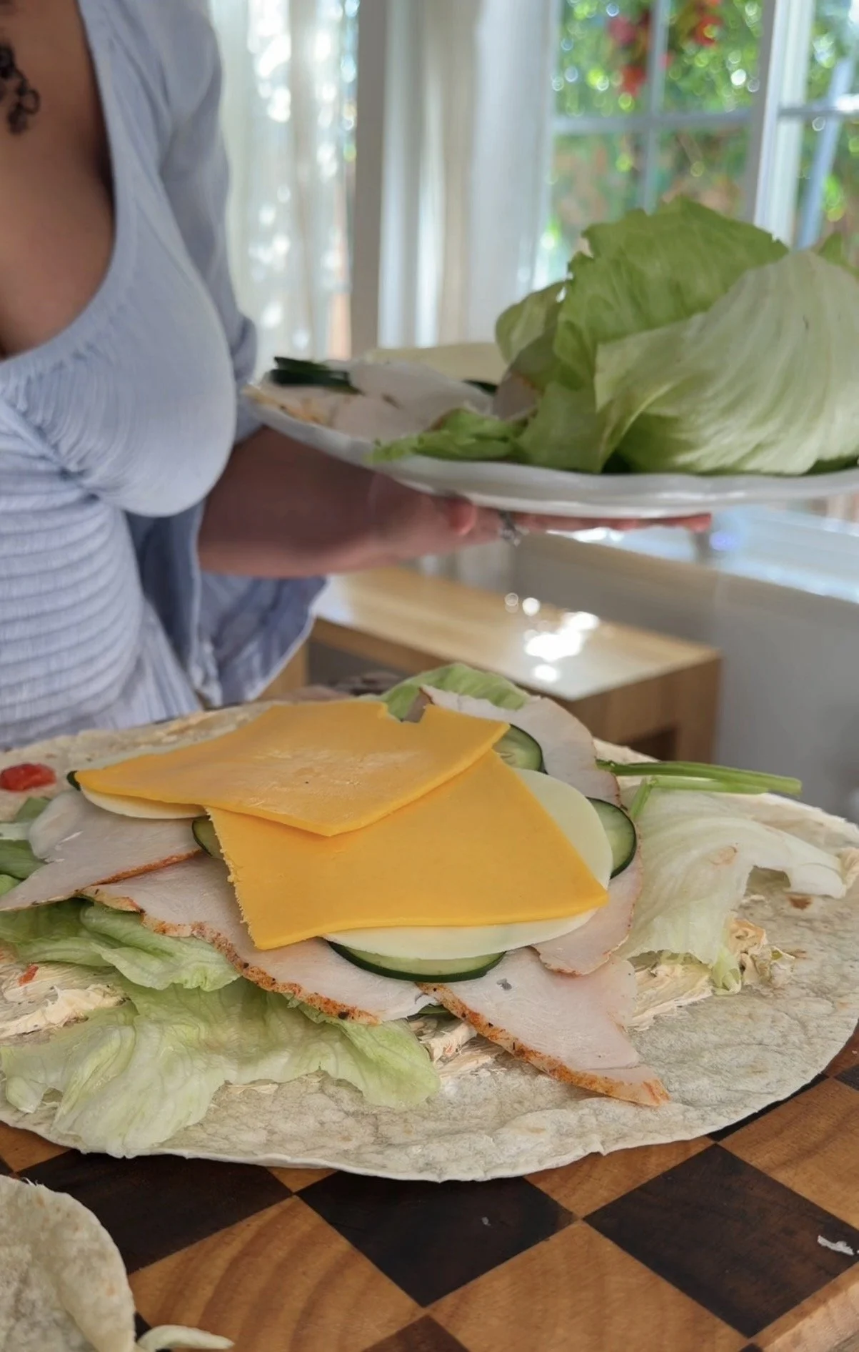 - For the turkey pinwheels, spread cream cheese mixture or mayo over another tortilla. Add lettuce, spinach, turkey, cucumber slices, provolone, and cheddar. Roll tightly.
