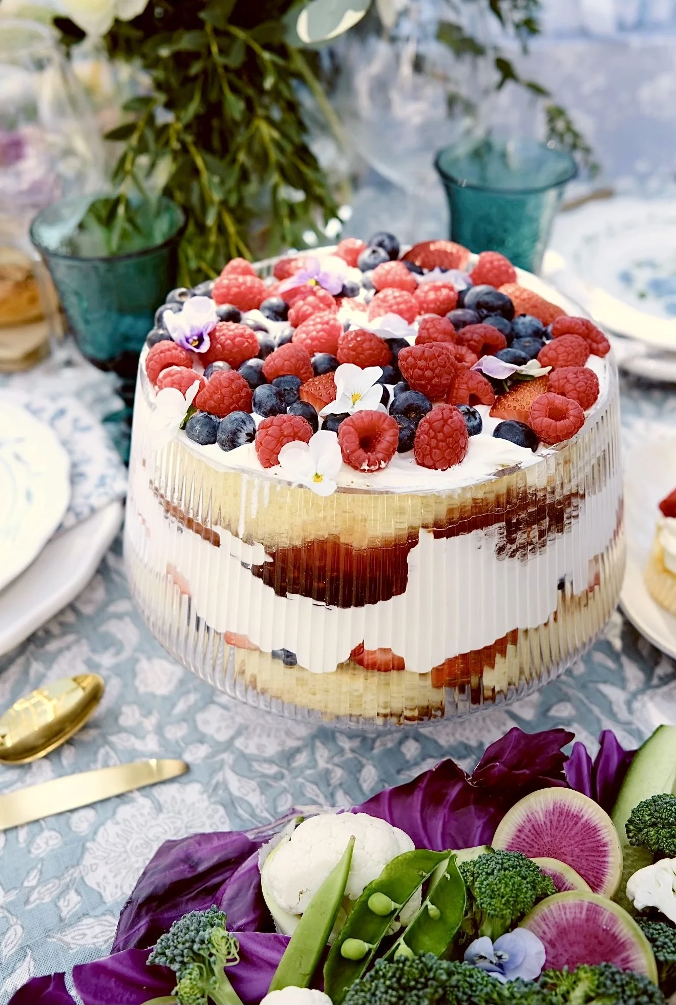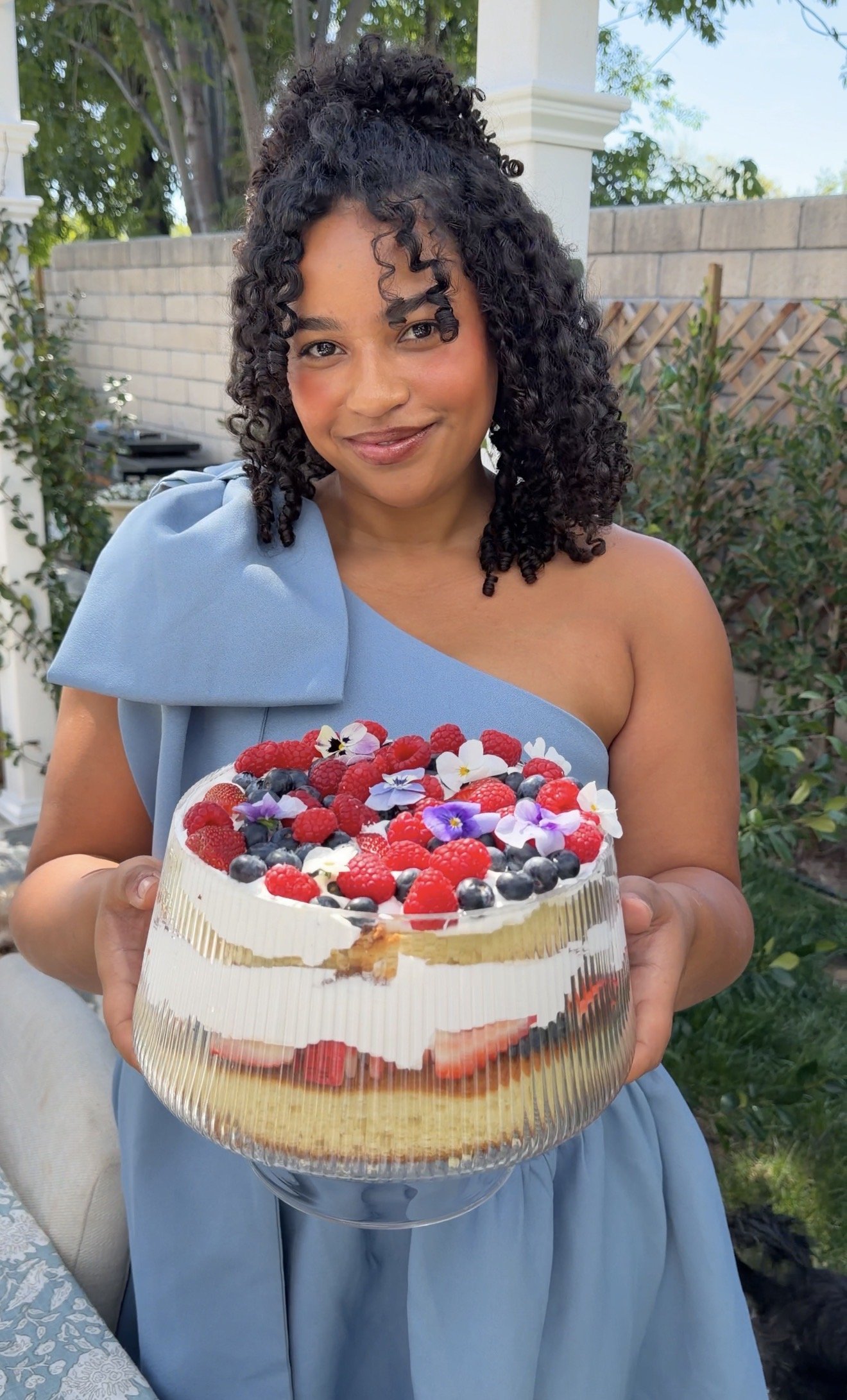 When I was creating the menu for my bridesmaids proposal, I just KNEW I had to have a lovely centerpiece trifle. These cakes are so simple to make and also so stunning. As a bride who has been super overwhelmed & a bit down during wedding planning, I knew I had to make this hosting experience as stress-free as possible. This cake is so so simple. All you need to do is layer cakes, cool whip, and berries! I am still working on my white cake recipe so unfortunately I won’t be sharing one in this blog post. I will update this as soon as I develop a recipe I love. Feel free to use your favorite white cake recipe or even a box mix for this! I considered using buttercream as one of the layers for this recipe, however, I decided on cool whip as it holds its form very very well even when left outside for a bit for a party!